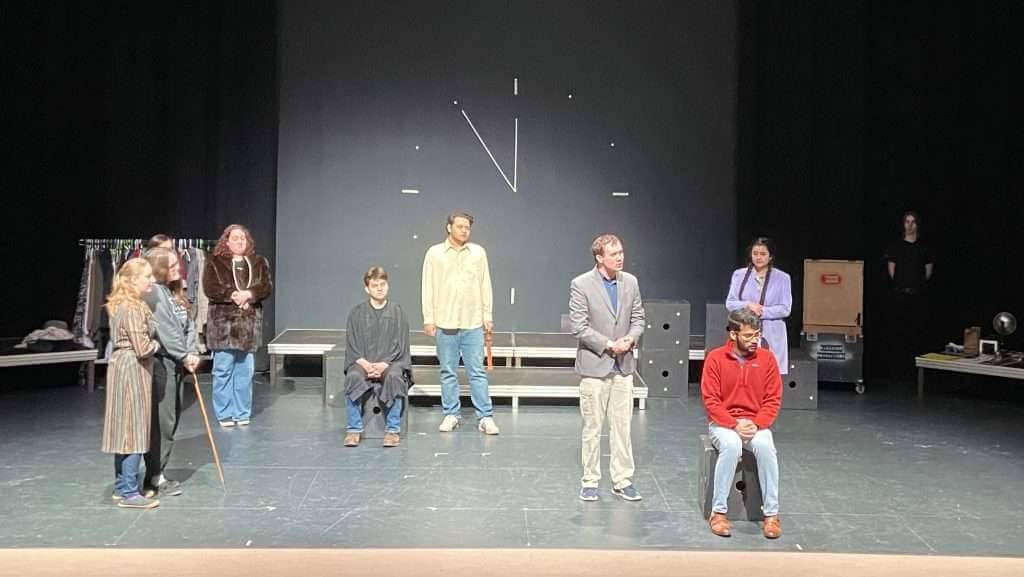 The play features over 30 characters but is designed for a cast of nine or ten actors, most playing multiple roles. Only two parts are big enough that their portrayers have single roles: Grace Fryer (played here by Jalyn Chapman) and U.S. Radium president Arthur Roeder (Adi Vella). The other parts in Vagabond’s version are filled by Mohamed Ateeq, Grace Biswas, Kyra Brewster, Reese Carmody, Madalyn Clempson, Marius Lavoie and Brennan McDuffee.